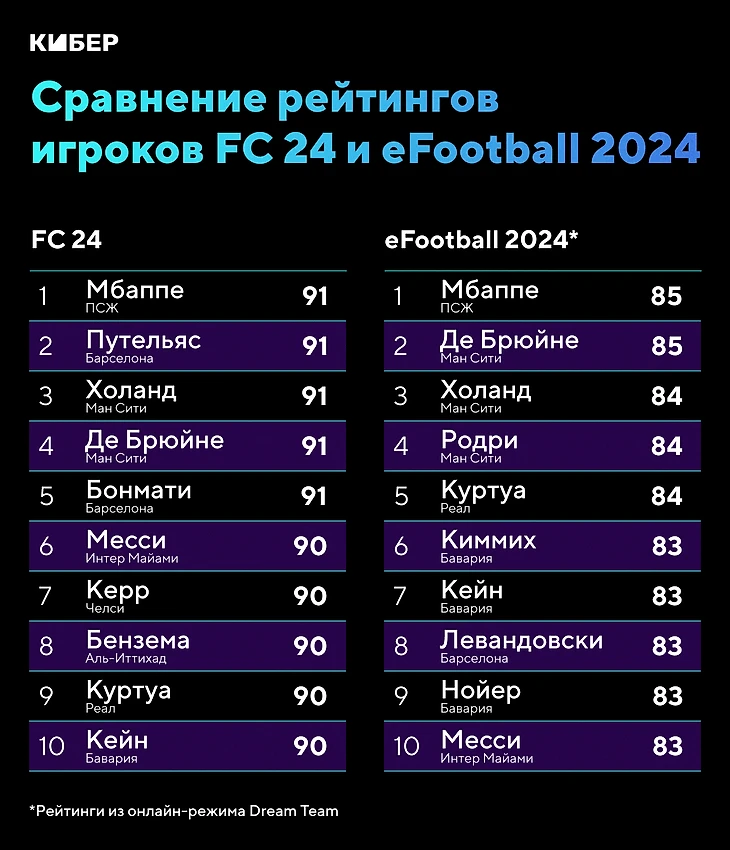 Сравнение рейтингов в FC 24 и eFootball 2024