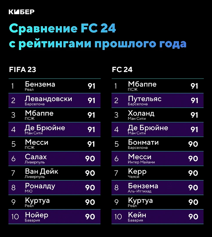 EA Sports представила официальные рейтинги лучших игроков в FC 24. Наибольший (91) у Килиана Мбаппе, Эрлинга Холанда и Кевина Де Брюйне, а лучшей футболисткой стала Алексия Путельяс.