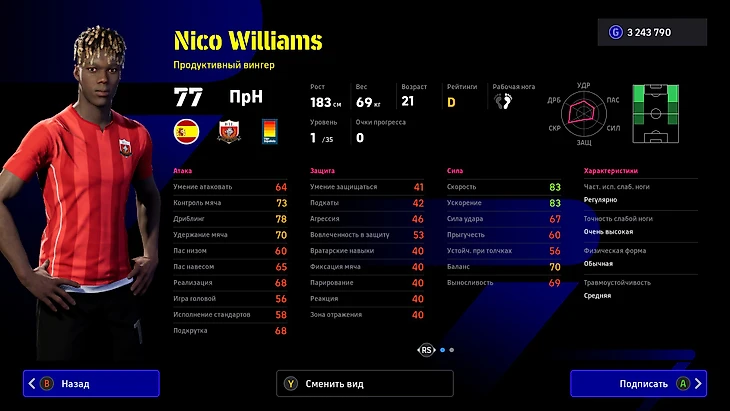 Брат Иньяки Уильямса Нико провел сильный сезон в «Атлетике» и дебютировал в сборной Испании. В симуляторе молодому вингеру дали высокую скорость и классный дриблинг, а реализацию ударов придется поднять вручную. Полезное умение Нико – игра на обоих флангах атаки.