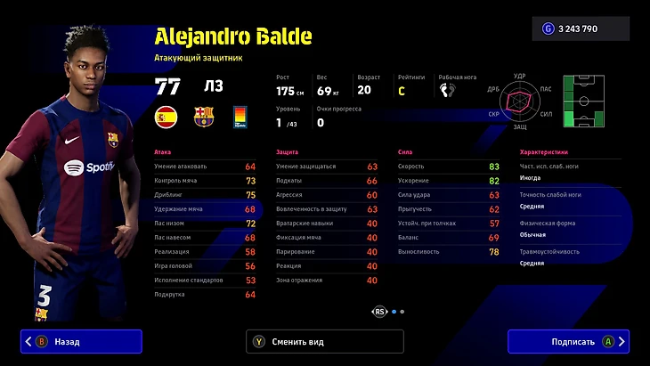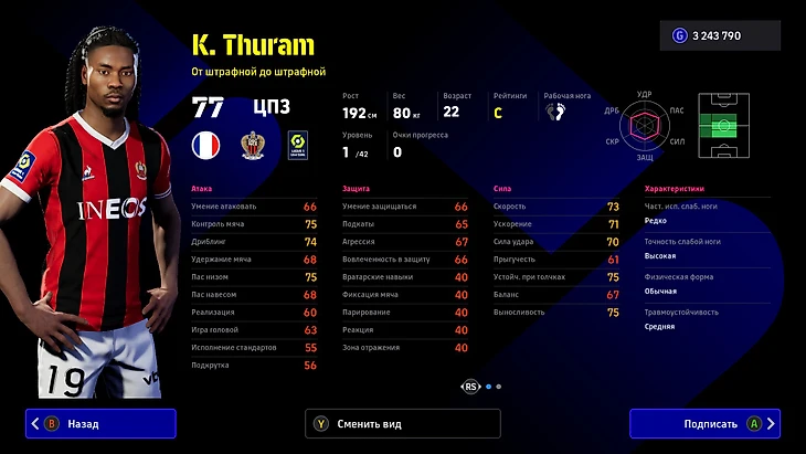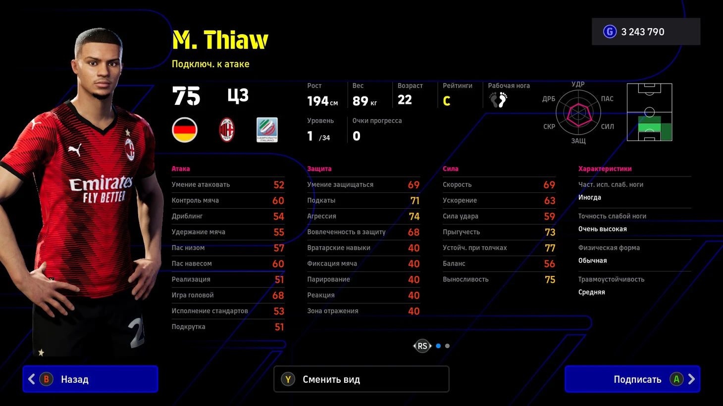 Немецкий защитник с финско-сенегальскими корнями Малик Тиав добрался до основы «Милана» и заслужил улучшение на шесть пунктов рейтинга. У центрдефа нет уникальных защитных характеристик, но он привлекает отменным ростом и корпусом – в футсиме Konami очень ценится физика.