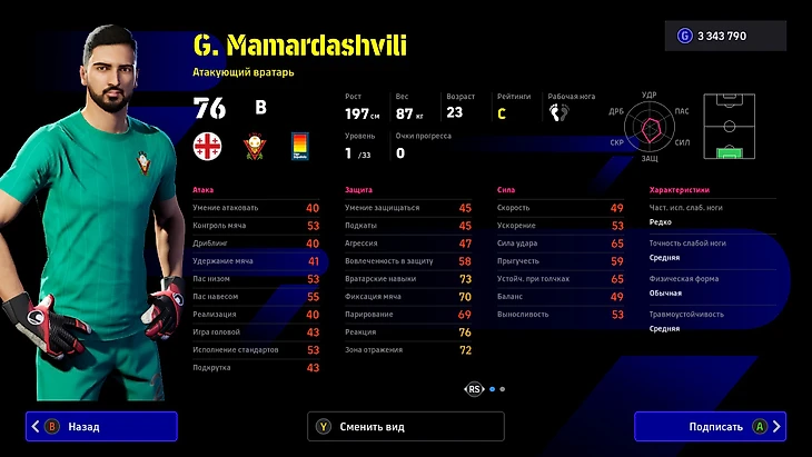 Георгий Мамардашвили – отличный стартовый вратарь. У грузина высокий рост (197 см), быстрая реакция, он далеко бросает мяч, а игра в основе «Валенсии» поможет ему чаще получать хорошие рейтинги формы.