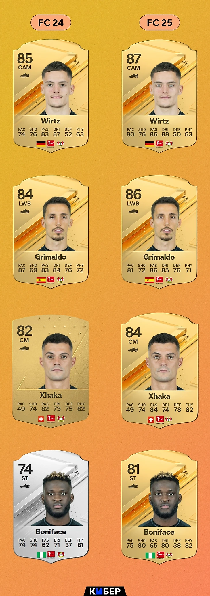 В новом футсиме EA лидерами клуба станут Флориан Виртц и Алекс Гримальдо, подтянется также капитан Гранит Джака. Нигерийский нападающий Виктор Бонифасе сменит серебряный цвет карточки на золотой.