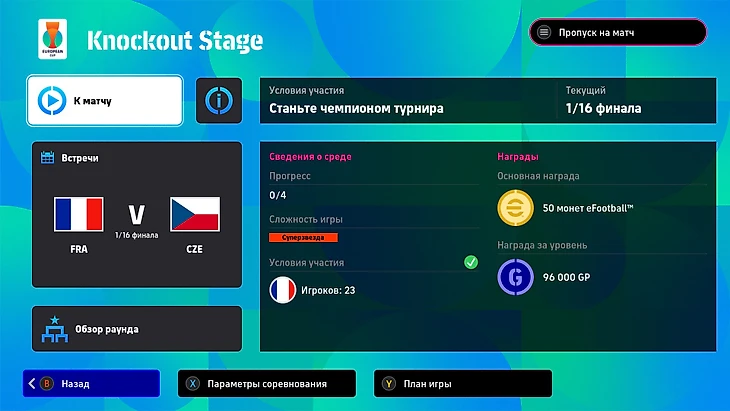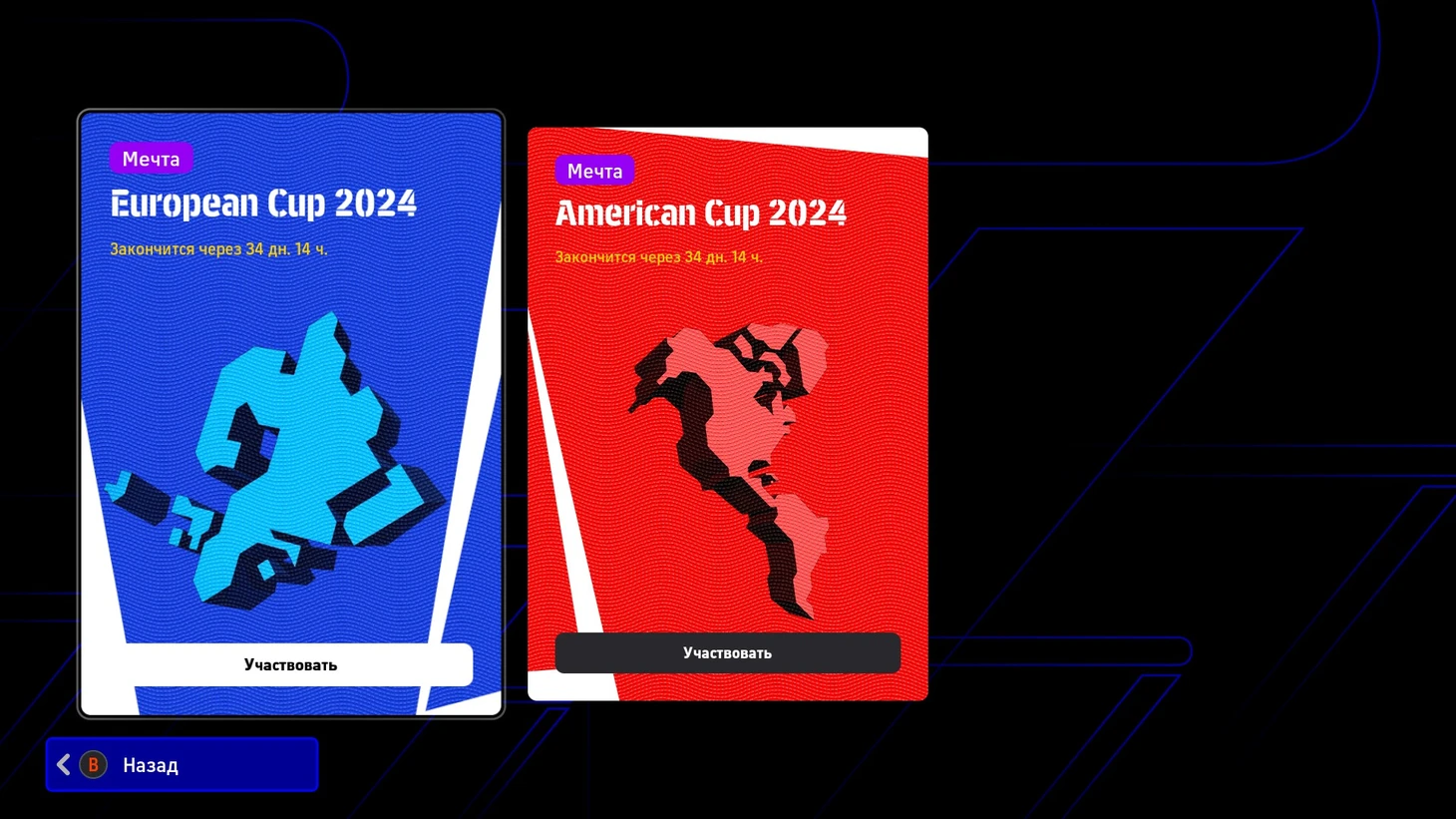European Cup 2024 начинается с выбора сборной (осторожно, ее нельзя поменять до конца события), дальше включаются специфические условия. У сборных неактуальные составы, карточки футболистов арендуются в активную онлайн-команду. Турнир разделен на два блока, групповой этап и плей-офф, причем игра настойчиво требует минимум пять очков для прохода дальше. Все матчи против ИИ, уровень сложности на ваш выбор. Кубок Америки устроен примерно так же.