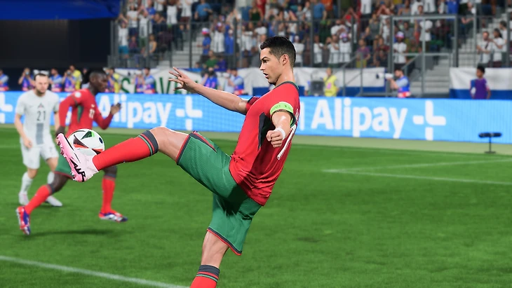 Словенцы показали очень надежную игру в обороне и вышли из группы без поражений, но из-за дисквалификации потеряли основного левого защитника – Эрика Янжа. Хорошей замены ему не было. Впрочем, португальцы атаковали не только по флангу Бернарду Силвы, и на 21-й минуте Рафаэл Леау открыл счет с паса Криштиану Роналду (1:0). Связка снова сработала на 43-й минуте: на этот раз Рон выдал эффектный акробатический трюк (2:0).