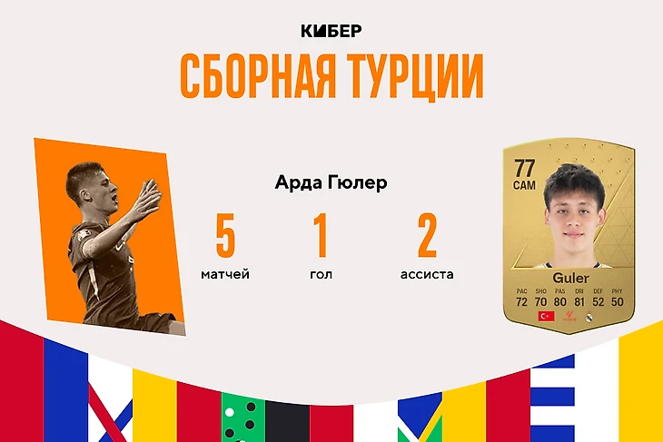 Турецкая сборная славится нестабильностью, а последний успех остался в далеком 2008 году – временах Хамита Алтынтопа и чудо-бомбардира Семиха Шентюрка. Лидером новой команды стал Арда Гюлер. Юный талант мадридского «Реала» красиво издали забил Грузии, а в матчах плей-офф с Австрией и Нидерландами вел партнеров за собой и отдал две голевые передачи.