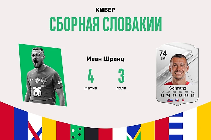 Словакия сотворила локальную сенсацию – вышла из группы и едва не прошла в 1/4 финала. Часто команде помогало голевое чутье Ивана Шранца. Правый вингер «Славии» воспользовался ошибкой защиты и забил победный гол Бельгии, а потом открыл счет во время героической битвы с англичанами. «Трех львов» спас удар через себя Джуда Беллингема, а Шранцу достался утешительный приз лучшему бомбардиру турнира.