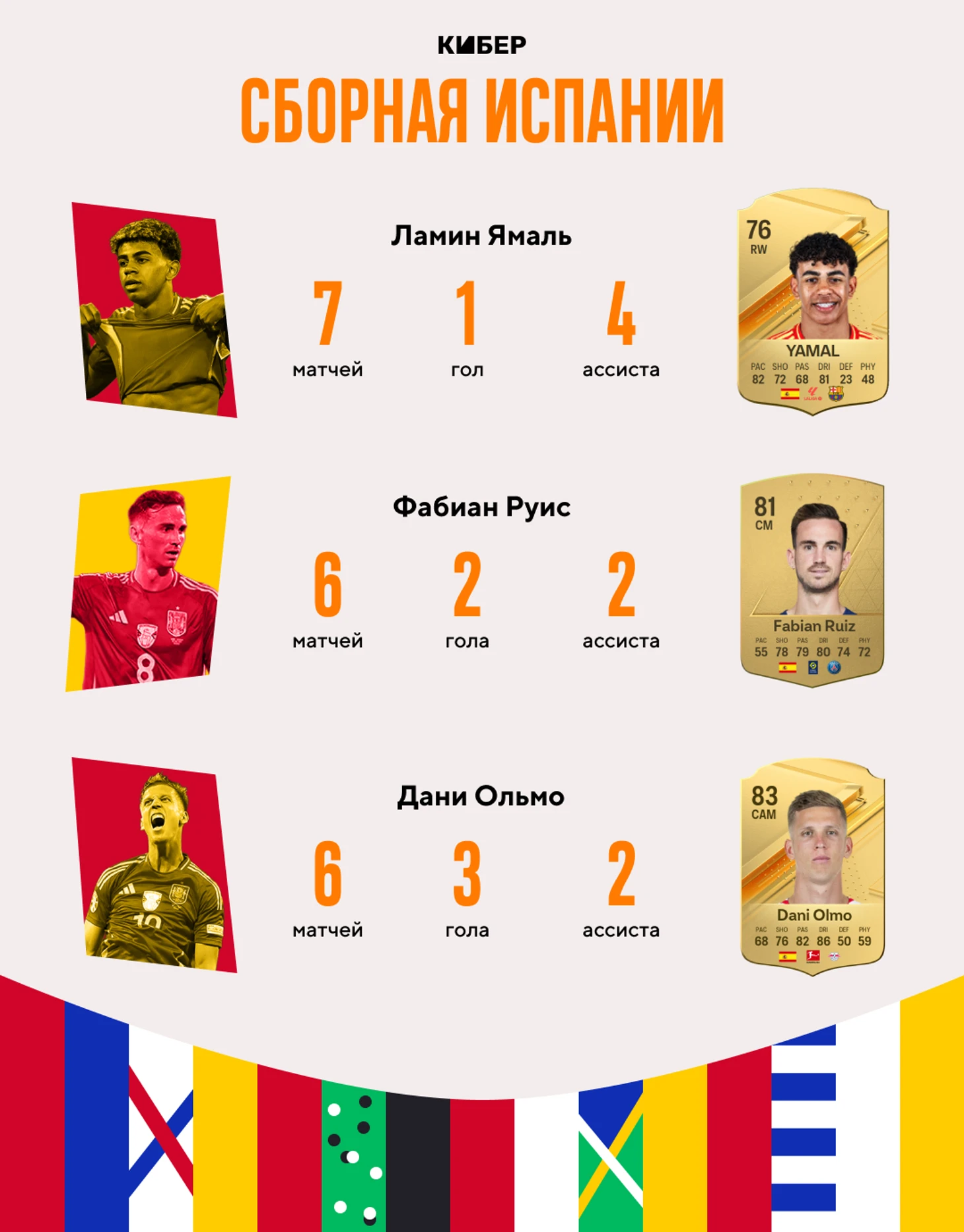 Ламин Ямаль, Фабиан Руис и Дани Ольмо (Испания)