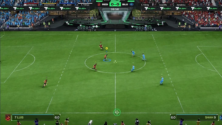 Для Rush укоротили футбольное поле и немного изменили правила. Матч начинается с того, что мяч выбрасывают в центр поля, причем скорость и место ввода (дальняя или ближняя боковая линия) случайны. Игроки находятся за пунктирными линиями и по истечении таймера бегут к мячу, пытаясь опередить соперника и получить первоначальное преимущество.