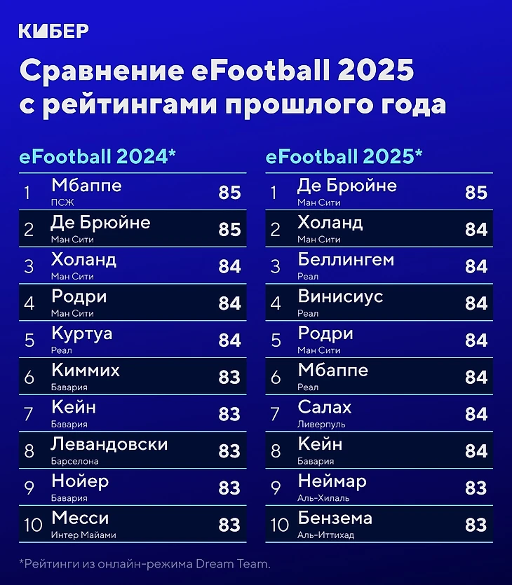За год в eFootball немного поменялись рейтинги. Килиан Мбаппе потерял первое место, подрос Джуд Беллингем, а еще слегка ослабили игроков «Баварии». Лионель Месси покинул топ-10, но сохранил прежний рейтинг – 83 в онлайне и 88 в офлайне. У Криштиану Роналду 82 балла (86 в аутентичных матчах).