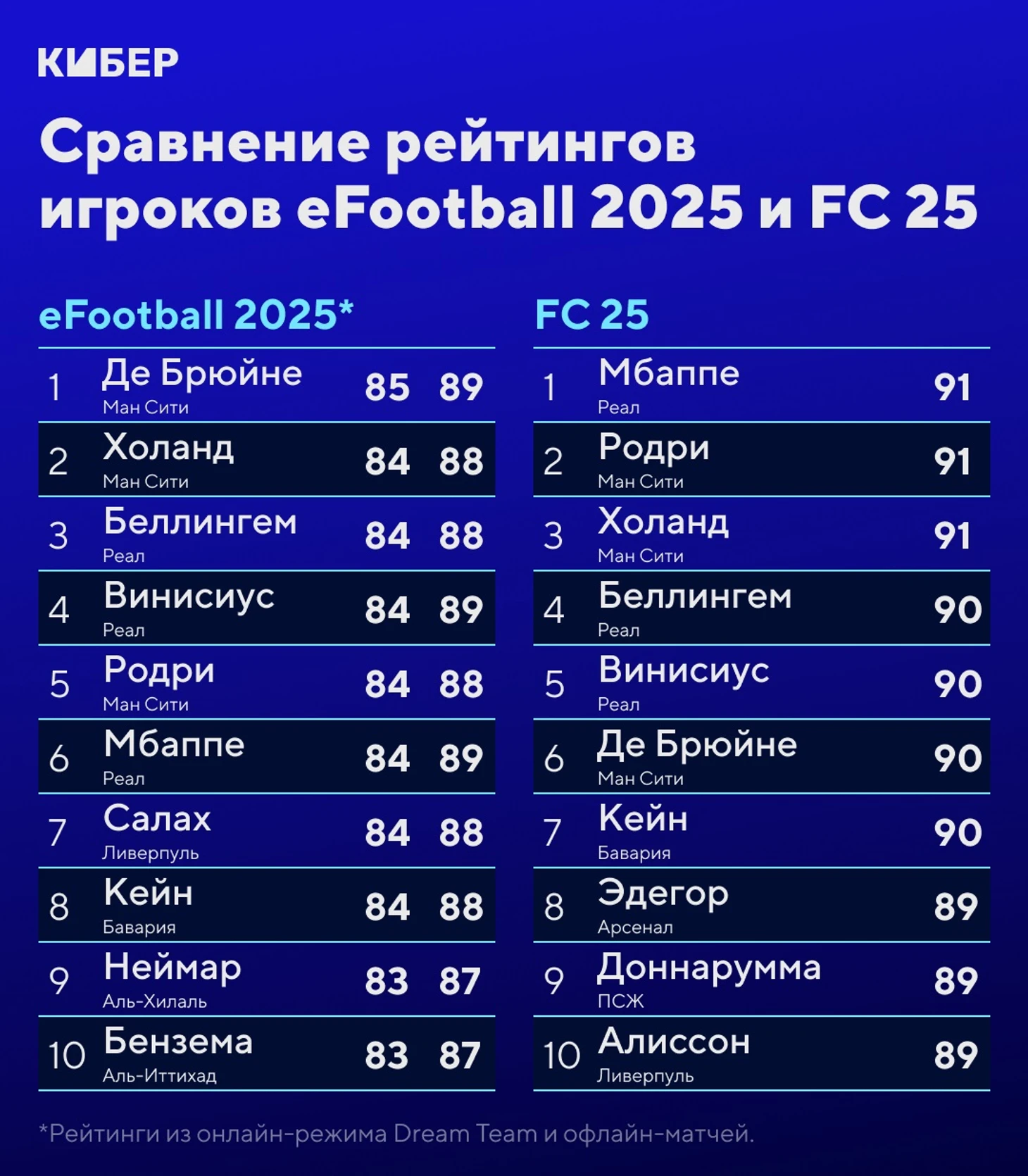 Первая шестерка симуляторов совпала – различается только порядок футболистов «Реала» и «Сити». EFootball чуть выше оценил КДБ и Мо Салаха, сдержаннее отнесся к Мартину Эдегору, а Джанлуиджи Доннарумма – только восьмой вратарь игры.