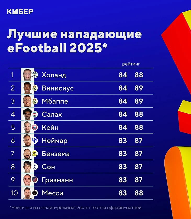 Винисиус Жуниор и Килиан Мбаппе из «Реала» – самые рейтинговые нападающие eFootball (по 89), хотя в онлайн-режиме «Команда мечты» их обогнал Эрлинг Холанд (все – по 84). На схожем уровне игры выделили Мохамеда Салаха и Харри Кейна.