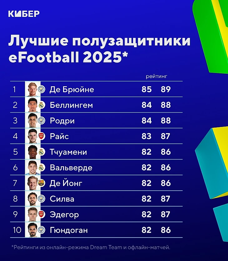 Кевин де Брюйне – лучший полузащитник eFootball 2025. В топ-3 также попали Джуд Беллингем и Родри (по 88), а на 4-е место неожиданно выдвинули Деклана Райса из «Арсенала». Немец Йозуа Киммих потерял один балл и переместился в защиту.