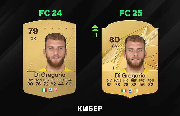 Микеле Ди Грегорио – один из двух лучший вратарей Серии A прошлого сезона. За «сухое» чемпионство «Интера» Ян Зоммер взлетел в элиту – 87, а вот экс-вратарю «Монцы» повезло гораздо меньше. Ди Грегорио вытащил для клуба 10,4 гола, попал в топ-3 лиги по проценту сэйвов (79,9), а летом отклонил три предложения «Ливерпуля» и перебрался в основу «Ювентуса», но заслужил лишь скромный апгрейд +1 – до рейтинга 80. Шестой результат в Италии.