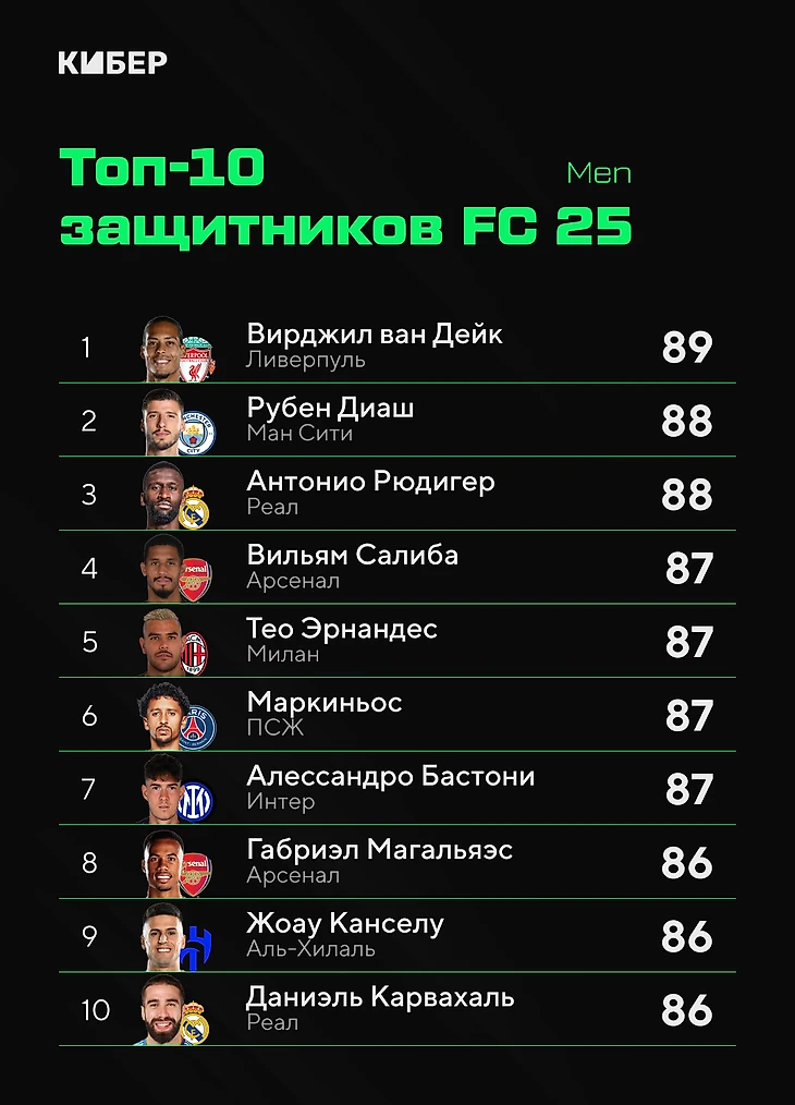 Топ защитников симулятора изменился до неузнаваемости. Лидер «Ливерпуля» Вирджил ван Дейк вернулся на первую строчку, Рубен Диаш из «Сити» получил небольшой даунгрейд и откатился на второе место, а тройку замкнул основной центрдеф «Реала» Антонио Рюдигер. Хорошие улучшения получили защитники «Арсенала» – Вильям Салиба и Габриэл, а рекордсмен по титулам прошлого сезона Дани Карвахаль попал в десятку.