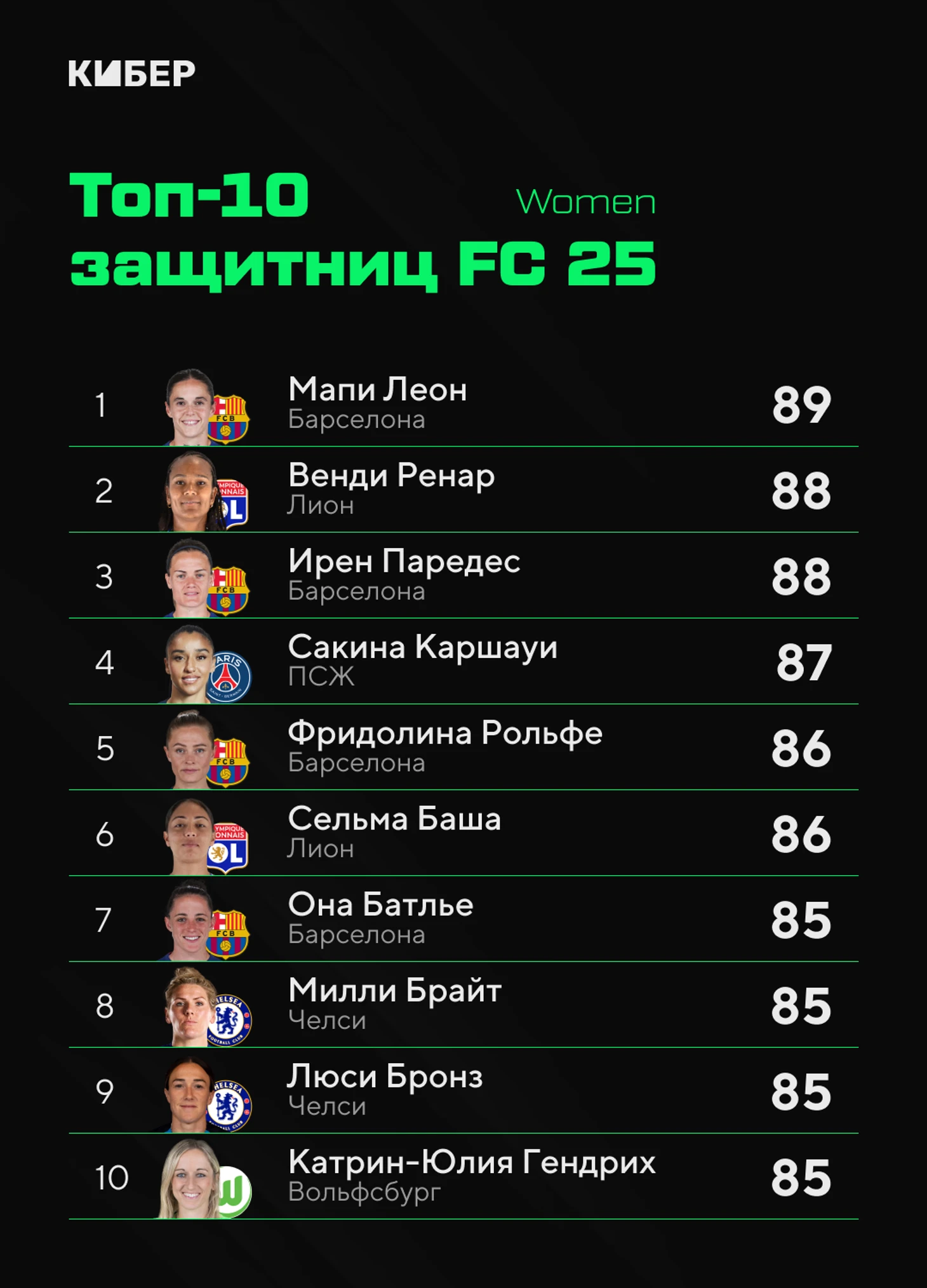 В женском топе обошлось без серьезных перемен. Мапи Леон из «Барсы» – снова лучшая защитница симулятора. Венди Ренар и Ирен Паредес остались в тройке, хотя поменялись местами. Топ-4 замкнула Сакина Каршауи из «ПСЖ», ее карточка стала еще сильнее.