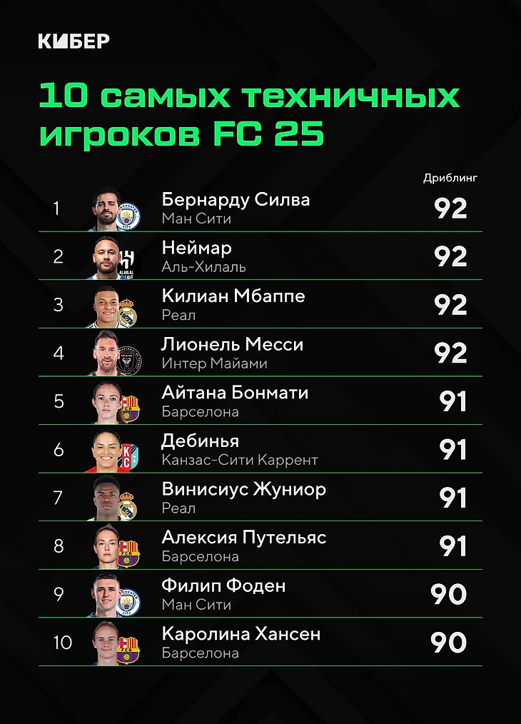 ● В FC 25 сразу четыре короля дриблинга – Бернарду Силва из «Ман Сити», Неймар из «Аль-Хилаля», Килиан Мбаппе из «Реала» и Лионель Месси из «Интер Майами» (по 92). В прошлом году лидировал только Лео (94).