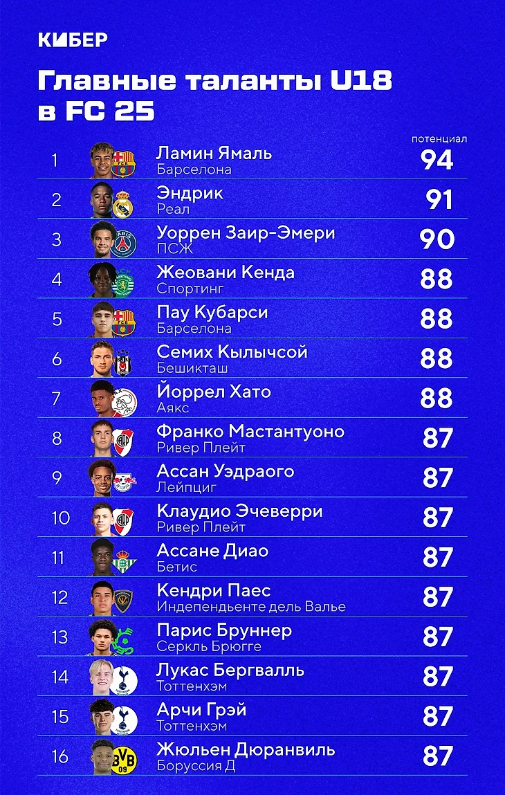 ● Самый высокий потенциал в карьере FC 25 среди игроков младше 23 лет получили Ламин Ямаль из «Барселоны», Джуд Беллингем и Винисиус (оба из «Реала») – 94. В шаге от них остановились хавбек «Баварии» Джамал Мусиала и форвард «Сити» Эрлинг Холанд (по 93).