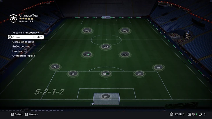 Нетипичная схема из киберспорта – 5-2-1-2. Тройка центральных защитников обеспечивает надежный тыл, центр поля компактно закрывают два выносливых бокс-ту-бокса и классный распасовщик, а латерали берут на себя всю бровку. Схема допускает высокую линии защиты (до 70).