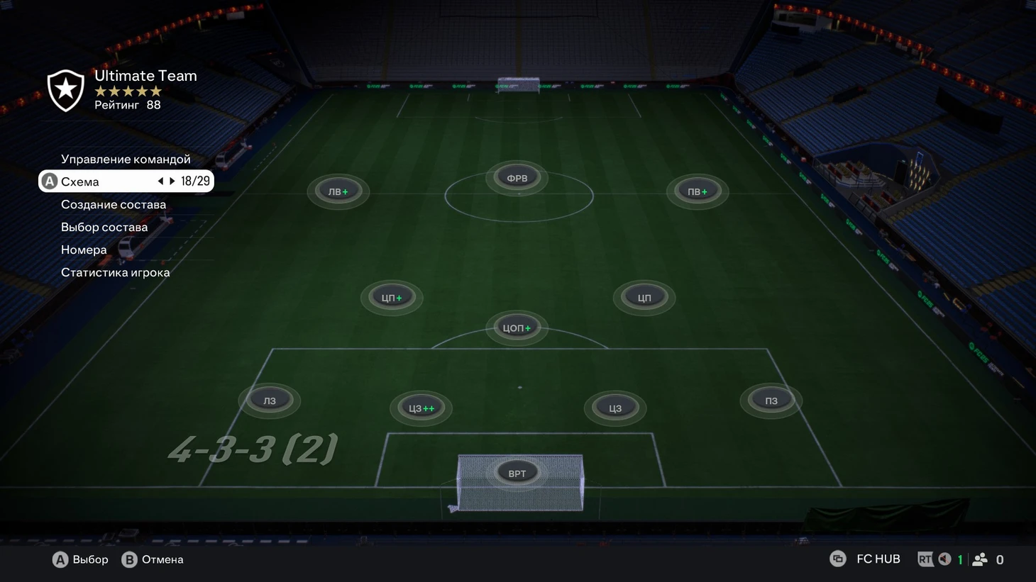 Схема с яркой атакой для опытных игроков. Напоминает популярную 4-2-1-3, но сложнее в защите – центральные хавбеки стоят выше и требуют внимательного ручного прессинга. Главное преимущество – агрессивная атака с высокими флангами и активным атакующим полузащитником под нападающим.