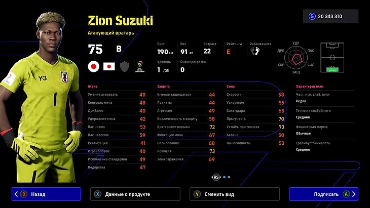 На позицию вратаря мы выбрали Зиона Судзуки из «Пармы». Японский кипер с ростом 190 см получил статы 80+ и стоит совсем копейки. Его главные плюсы – крепкий корпус и отличные прыжки.