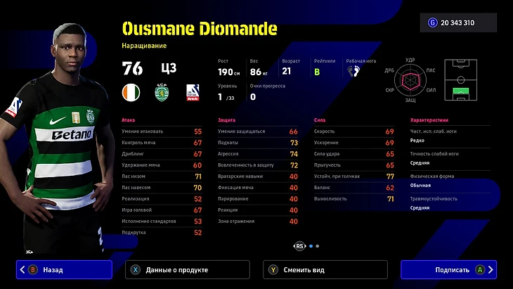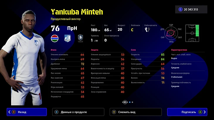 Вариант подешевле – Янкуба Минте. Гамбийский правый вингер получил фантастическую скорость (прокачивается выше 90), а 38 уровней помогают подтянуть передачи и дриблинг. Навык паса вразрез очень пригодится для комбинаций.
