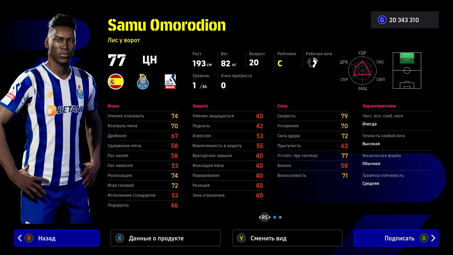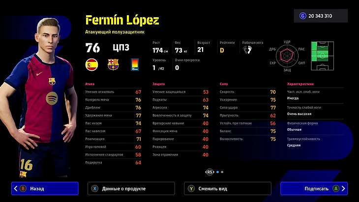 Фермин тоже играет в центре, но его показатели смещены к нападению. Характеристики испанца универсальные, главное оружие – меткое завершение. Навык «Боевой дух» и хорошая выносливость компенсируют плохие отборы.