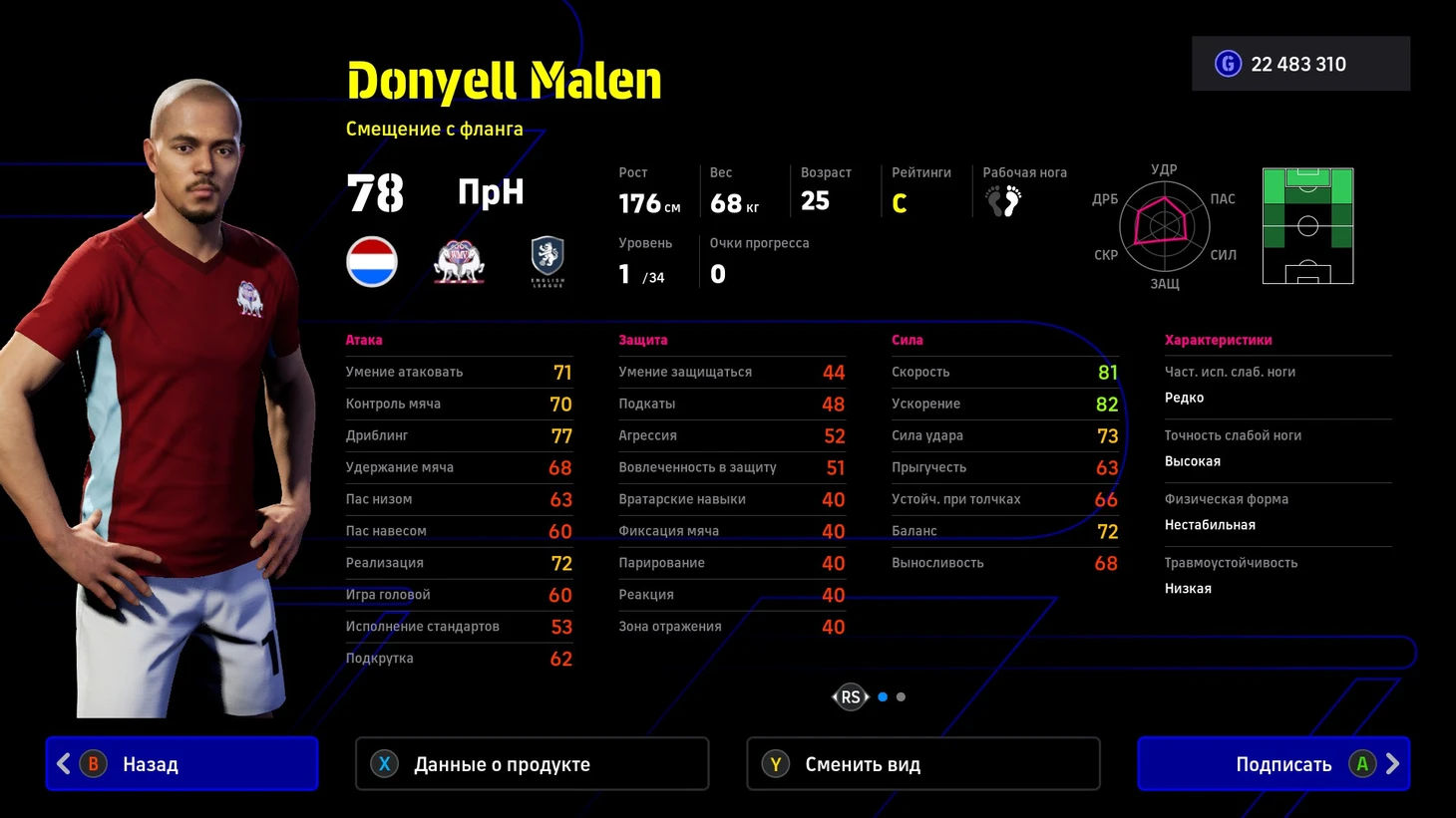 Дониэлл Мален – отличный универсальный нападающий с навыком «Суперзамена». Он играет на трех позициях в атаке, очень быстрый, техничный, а при ручной прокачке хорошо реализует моменты. Мален бьет издали и пасует в одно касание.