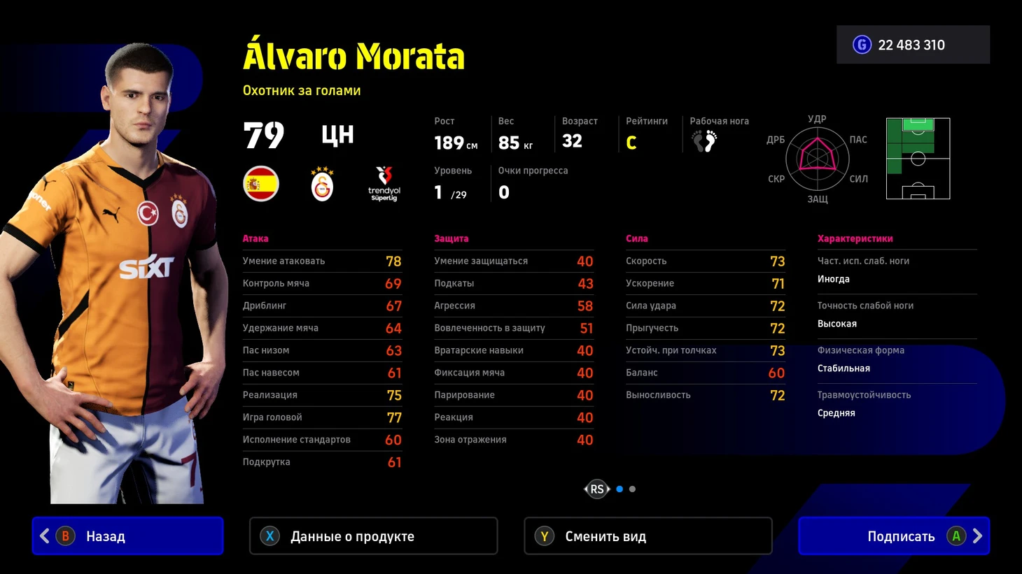 Сбалансированный форвард штрафной. Альваро Мората обладает неплохой скоростью для коротких рывков, достаточно точно завершает, активно играет головой и крепко стоит на ногах. У испанца целый набор дополнительных способностей – от передач в касание до закрученных дальних ударов.