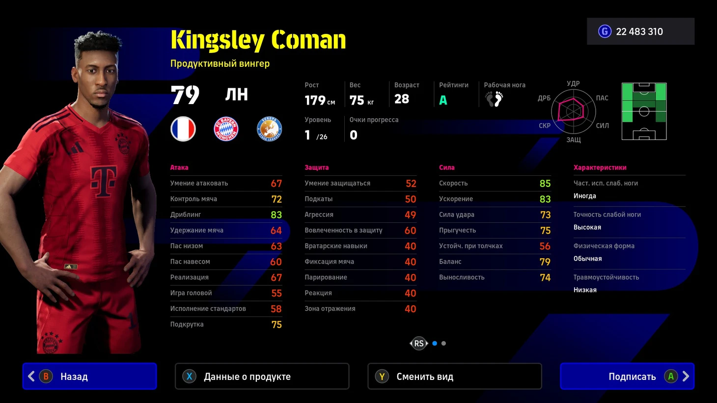 Звездный вингер «Баварии» стоит совсем недорого. У Кингсли Комана превосходный спринт и отличный дриблинг с несколькими финтами, а вот удары похуже. Француз играет на обоих флангах и часто получает бонусы за игру в реальности.