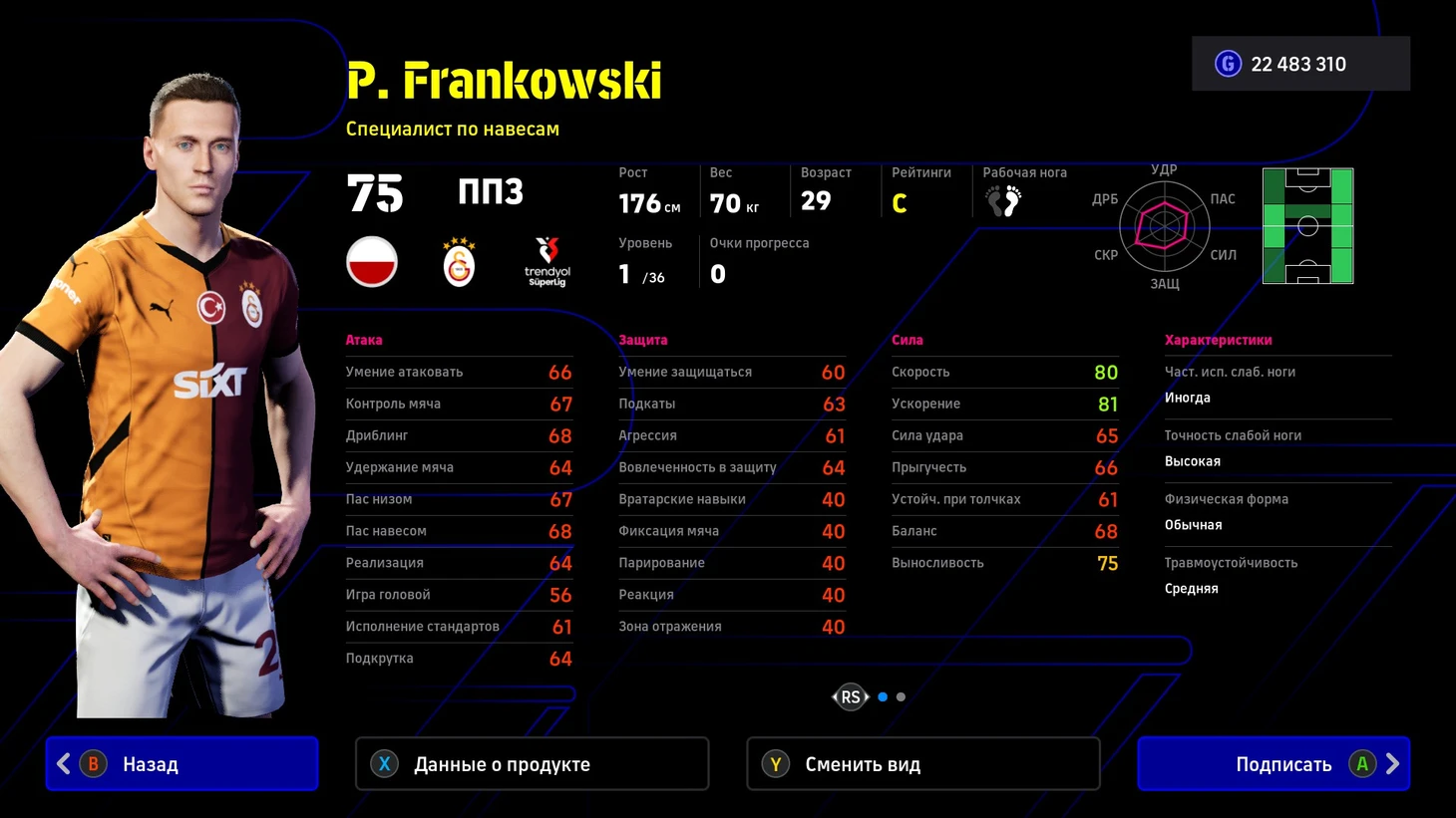 Франковски идеально играет на четырех позициях, самая интересная – правый защитник. У поляка средние, но универсальные характеристики. Сильнейшая сторона – высокая скорость, еще отметим пасы на ход и надежность под давлением из-за «Боевого духа».