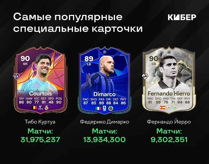 Какие особые карточки чаще всего встречаются в Ultimate Team? На первом месте улучшенная версия Тибо Куртуа. Карточка Track Stars вышла в ноябре и стала народной – сразу 32 млн матчей. Остальным помешала высокая цена. Второй оказалась лигочемпионская карта Федерико Димарко из «Интера» (13 млн), на третьем месте – кумир Фернандо Йерро (9 млн).
