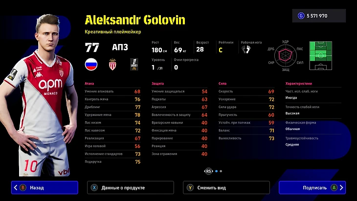 Второй по силе – Александр Головин. Российский хавбек уже семь лет играет за «Монако» и считается главной отечественной звездой, но этим летом он получил небольшой даунгрейд и уступил Сафонову. Konami понизила скорость и атакующие навыки Александра, хотя все еще признает его одним из лидеров «монегасков».