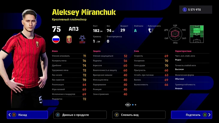 Брат-близнец Алексея Антон тоже недавно играл в Европе. Атакующий хавбек перешел свободным агентом в швейцарский «Сьон» и казался будущим лидером клуба, но провел средний сезон (2+3 по «гол+пас» в 24 матчах) и вернулся в «Динамо». Показатели Антона Миранчука в eFootball 2026 напоминают брата, а вот геймфейс у них разный.