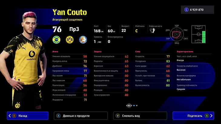 Универсальный форвард из дортмундской «Боруссии». Карим Адейеми поражает характеристиками скорости и моментально перескакивает отметку 90 баллов, а еще неплохо завершает – вручную удары можно поднять до 83. Вингер знает несколько финтов, бьет в одно касание и усиливает игру со скамейки, но очень плохо пасует.