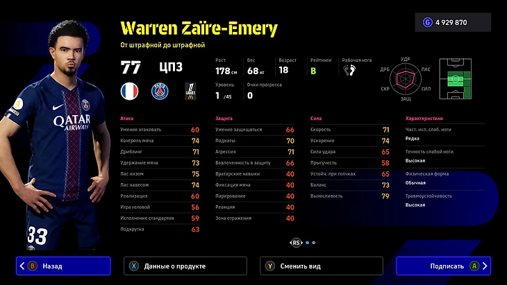 Уоррен Заир-Эмери – превосходный бокс-ту-бокс. Молодой талант «ПСЖ» отличается хорошими пасами, дриблингом и быстро перемещается по полю. Хавбек получил массу базовых умений, включая три типа передач и защитные навыки. Слабые корпус и посредственные удары практически не мешают французу.