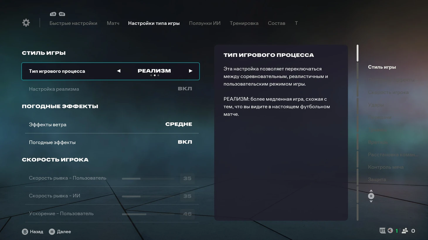 Экспериментальный реалистичный режим появился в прошлой части. EA Sports повысила отзывчивость геймплея и сделала аутентичный режим основным в карьере (хотя его всего можно переключить на обычный). В «реализме» игроки бегут медленнее и чаще ошибаются, ветер меняет траектории подач, а ИИ-защитники компактнее сидят и ворот и допускают меньше свободных зон.