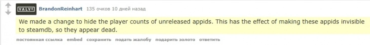 «Теперь мы будем скрывать статистику по игрокам в невыпущенных приложениях. Теперь они просто не отображаются на SteamDB, и их нельзя увидеть в онлайне».