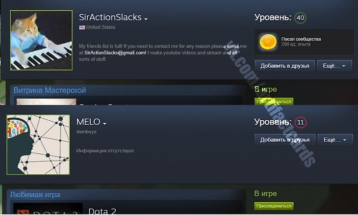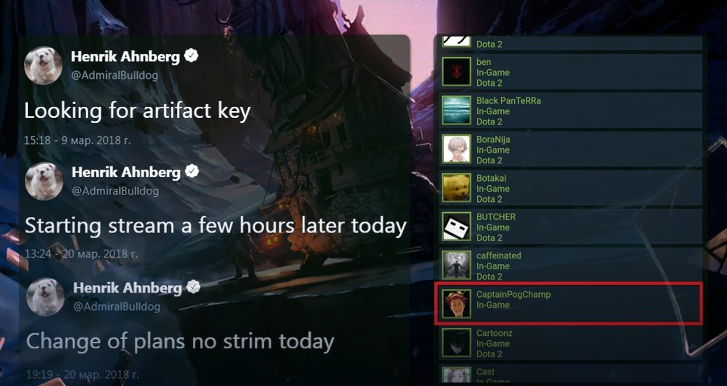 • 76561197964547457 # Synderen (Кастер и профессионал в Dota 2)• 76561197997771294 # Dave?• 76561198031242937 # TheZvi• 76561198051143960 # HEFFAKLUMPEN (Профессионал в MtG)• 76561198102850581 # Lifecoach (Профессионал в Hearthstone и Gwent)• 76561198153939374 # Lyrical (Англоязычный Комментатор Dota 2)• 76561198202051034 # Ondrej Strasky (Профессионал в MtG)• 76561198304358728 # Stancifka (Профессионал в Hearthstone)• 76561198804111004 # Offstream Chill? • basskip (Англоязычный комментатор Dota 2)• brandonrvalve (Главный разработчик Artifact)• brunocarlucci (Англоязычный комментатор и статсман Dota 2)• dpmlicious (Одна из интервьюеров на The International)• fwosh (Стример и контентмейкер Dota 2)• greuben (Разработчик в Valve)• jeepbarnett (Разработчик в Valve)• jeffleinbaugh (Разработчик в Valve)• leafeator (Модератор сабреддита Dota 2)• luminous48 (Англоязычный комментатор Dota 2)• melode (Уже удалил данный Steam id)• mrmooear (Разработчик Artifact)• primeapeyoshi• quantumpope (Англоязычный комментатор Dota 2)• rsmerchant (Англоязычный кастер)• siractionslacks (Англоязычный комментатор Dota 2)• sunsfan (Англоязычный комментатор Dota 2)• wykrhm (Инсайдер и аналитик патчей Dota 2)• zoid (Разработчик Dota 2, который недавно ушел из Valve)