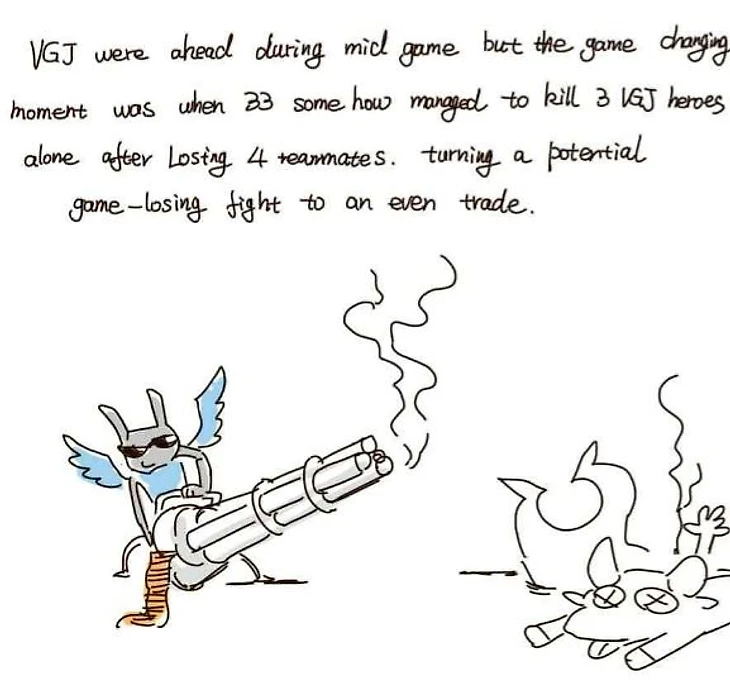 В середине одной из карт VGJ вели. В очередной драке 33 каким-то чудом смог убить трех героев VGJ после того, как потерял 4 своих тиммейтов.