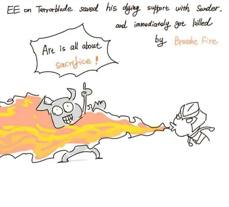 В матче за выход из группы против Natus Vincere игроки Fnatic шли на любые жертвы, чтобы победить. EE на Террорблейде спас своего саппорта с помощью Сандера и был сожжен через Breathe Fire. Fnatic эту серию, как мы знаем, выиграли.