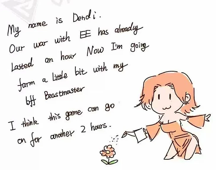 «Меня зовут Dendi. Наше сражение с ЕЕ идет уже час. Теперь я собираюсь немного пофармить вместе с моим лучшим другом Бистмастером. Думаю, эта игра может идти еще пару часов».