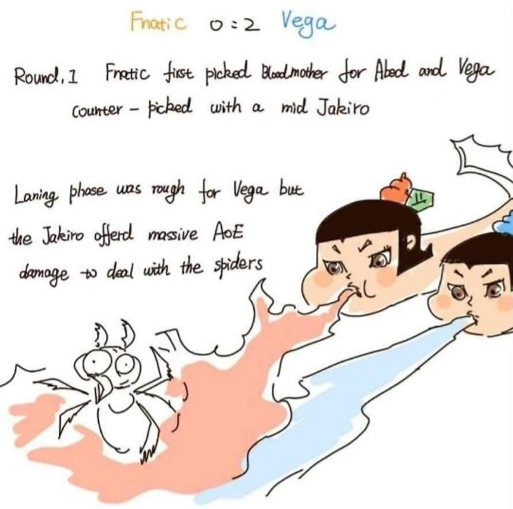 Vega Squadron в матче с Fnatic законтрила Абеда на Бруде с помощью Jakiro. Стадия лайнинга для Веги была непростой, но AOE заклинания Джакиро помогли справиться с пауками.