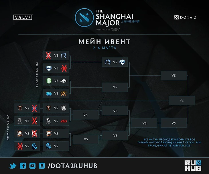 Ещё одна наша команда, которая также оказалась не в завидном положение. К тому же "медведям" достался серьёзный противник в лице VG, а они, как и остальные китайцы набирают походу турнира и вполне могут выкинуть нашу команду. Однако судя по результатам групповой стадии, где VG заняли 4-ое место, проиграв даже Team Spirit, есть небольшое сомнение, смогут ли VG вообще что-то показать на этом турнире. Очень часто Vici Gaming в решающих матчах берут какой-либо жёсткий лейт и просто тянут игру, Virtus.Pro же вероятнее всего сыграют через агрессивный пуш с Death Prophet, возможно Chen или Oracle. Как бы плохо не выступили VP с этой стратой в группе, в Play-off я уверен будет всё по другому. Virtus.Pro также могут попробывать пройти до ТОП-8, однако их соперники будут намного хуже, предположительно после VG, они могут встретиться с проигравшим OG/Secret. Соперники являются очень сильными, однако скорее всего это будут Secret, которые не показывают какие-то положительные результаты. Благодаря этому VP смогут попасть минимум в ТОП-8.