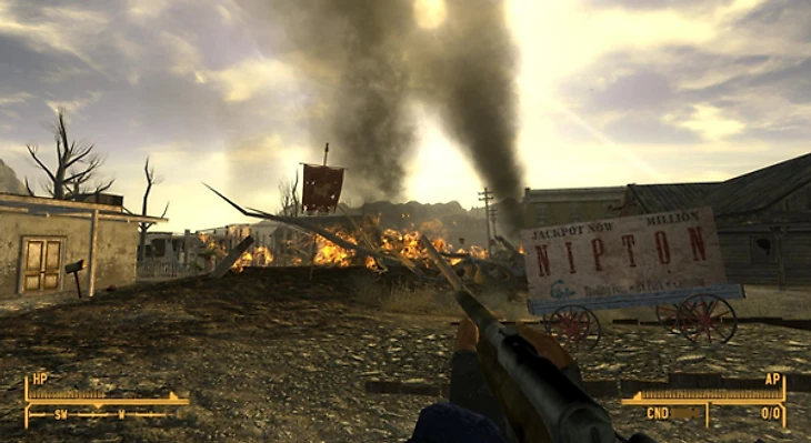 Большая карта, наполненная открытыми локациями, на которых шла бесконечная война между местными фракциями, задерживала игрока на десятки и сотни часов. Идешь по дороге никого не трогаешь, натыкаешься на торговца с охраной и нагруженным брамином, как вдруг на них нападают бойцы легиона Цезаря, закидывая тех копьями. Охрана и торговец отстреливают нападавшим головы, а потом как ни в чем не бывало, продолжают путь. Fallout - это про исследование мира в поисках интересных мест, запоминающихся персонажей, редкого оружия. Это тот случай, когда игроки откладывают сюжетные задания в долгий ящик и идут куда угодно, но только не по указанному квестом маркеру.