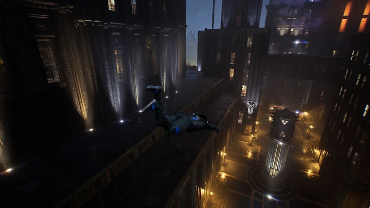 Дорога займет больше времени, чем само задание. А ведь перемещаться по Готэму не так весело, как в Arkham Knight. Герои не умеют парить на плаще, как Бэтмен – они только взмывают ввысь на крюке-кошке и прыгают по крышам. Или же катаются на мотоцикле, которому далеко до бэтмобиля в плане удобства.