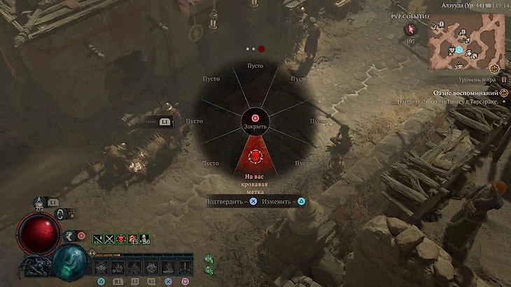 Включить Кровавую метку легко. А вот для возвращения в мирный режим бегите в ближайший город и молитесь у Алтаря очищения.