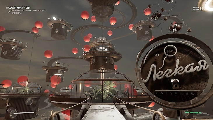 Зрелищные локации на месте. Они не шокируют, как праздник из вступления к Atomic Heart, но вы все равно будете их разглядывать. Взять хотя бы гостиницу «Легкая», где номера висят в воздухе, а дорожки постоянно перестраиваются.
