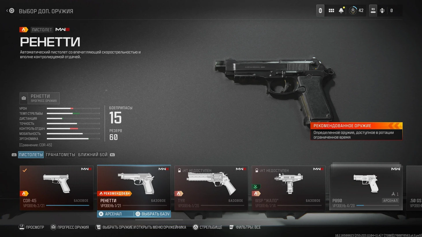 Отличный запасной ствол для ситуаций, когда бой идет, а времени на перезарядку нет. У Ренетти достойные для пистолета точность и урон.