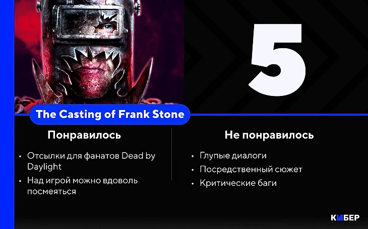 Похоже, сама Supermassive относилась к The Casting of Frank Stone как к проходняку, который поможет протянуть до крупных релизов вроде Directive 8020 и Little Nightmares 3. Написали простецкий сюжет, придумали персонажей с характером на одну строку, не успели нормально все отполировать. Вот и результат получился сомнительным: заценить можно, но и пропустить не жалко.