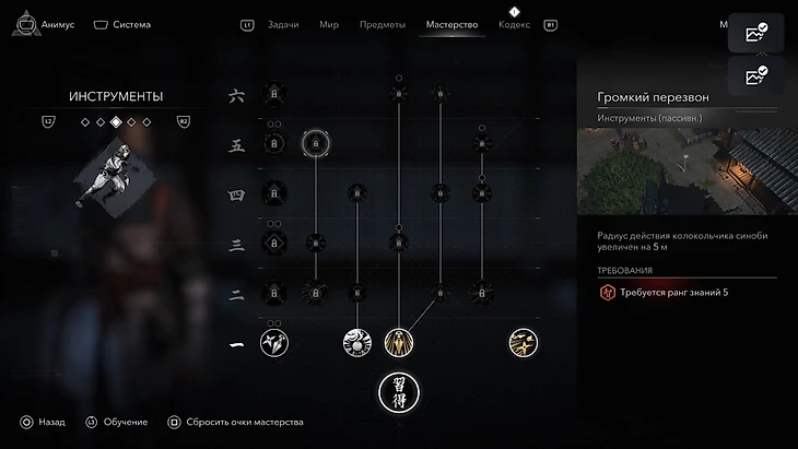• Колокольчик синоби – Золотой колокольчик – Громкий перезвон. Колокольный звон отвлекает противников. Полезно, чтобы прошмыгнуть в нужное место или разделить цели. Со временем радиус действия увеличивается.